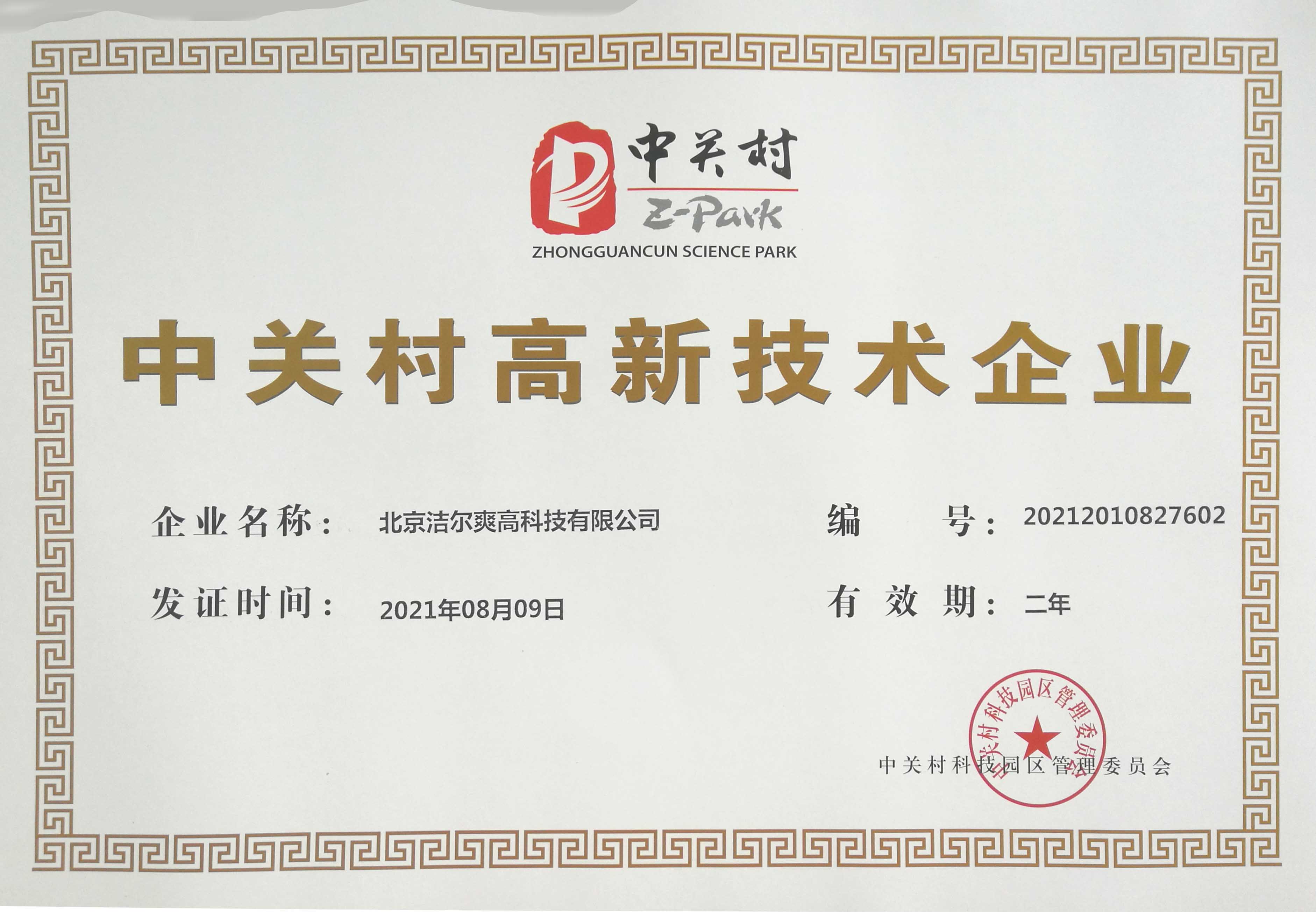 北京潔爾爽高科技有限公司繼續(xù)獲得中關(guān)村高新企業(yè)證書